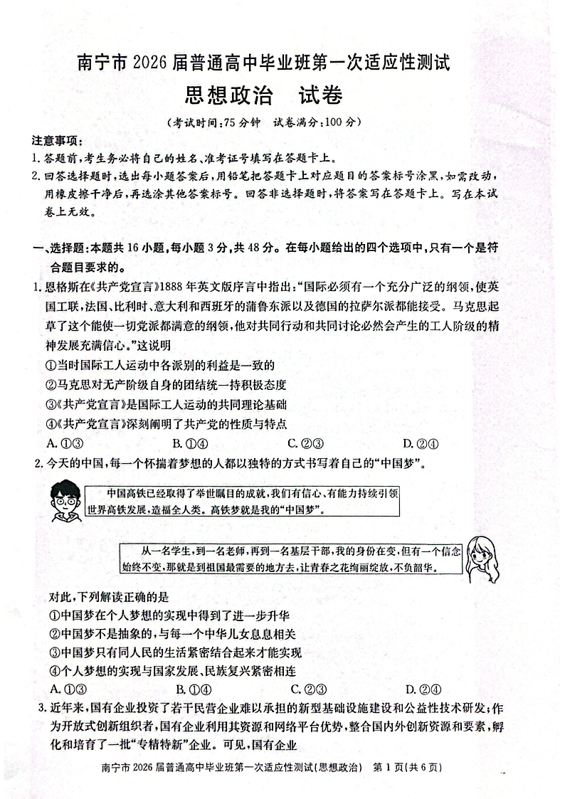 高三政治--广西南宁市2026届普通高中毕业班第一次适应性测试(南宁一模)