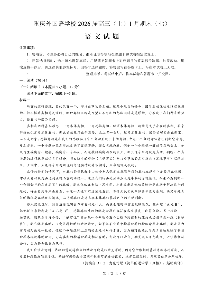 高三语文--重庆实验外国语学校2026届高三1月期末考试(七)
