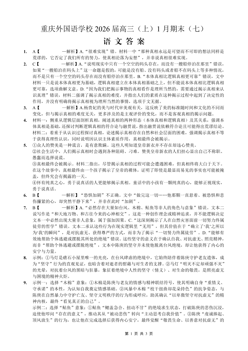 高三语文答案--重庆实验外国语学校2026届高三1月期末考试(七)