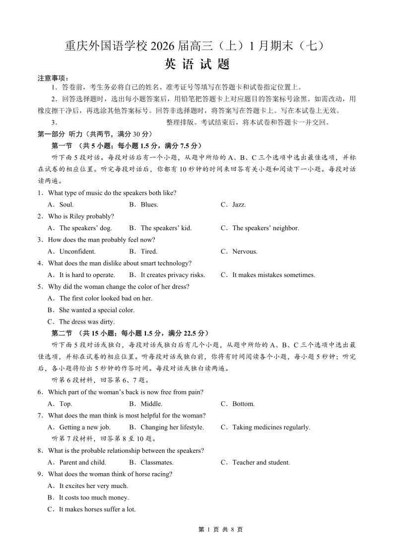 高三英语--重庆实验外国语学校2026届高三1月期末考试(七)