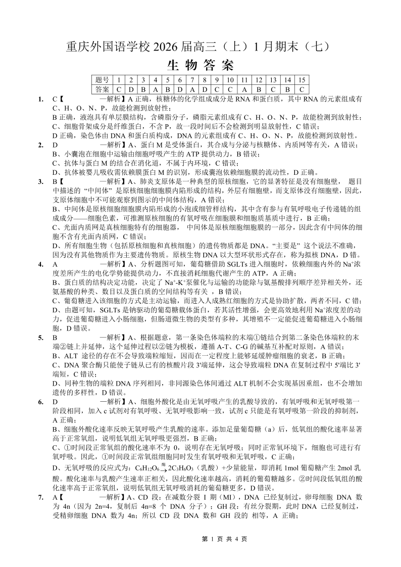 高三生物答案--重庆实验外国语学校2026届高三1月期末考试(七)