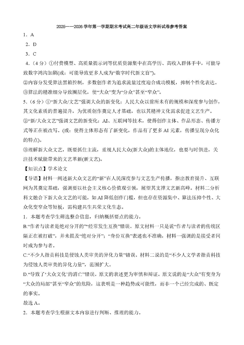 高二语文答案--甘肃省兰州市八校联考2025-2026学年高二上学期期末考试