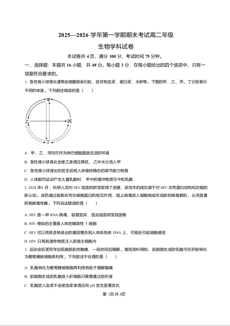 高二生物+答案--甘肃省兰州市八校联考2025-2026学年高二上学期期末考试
