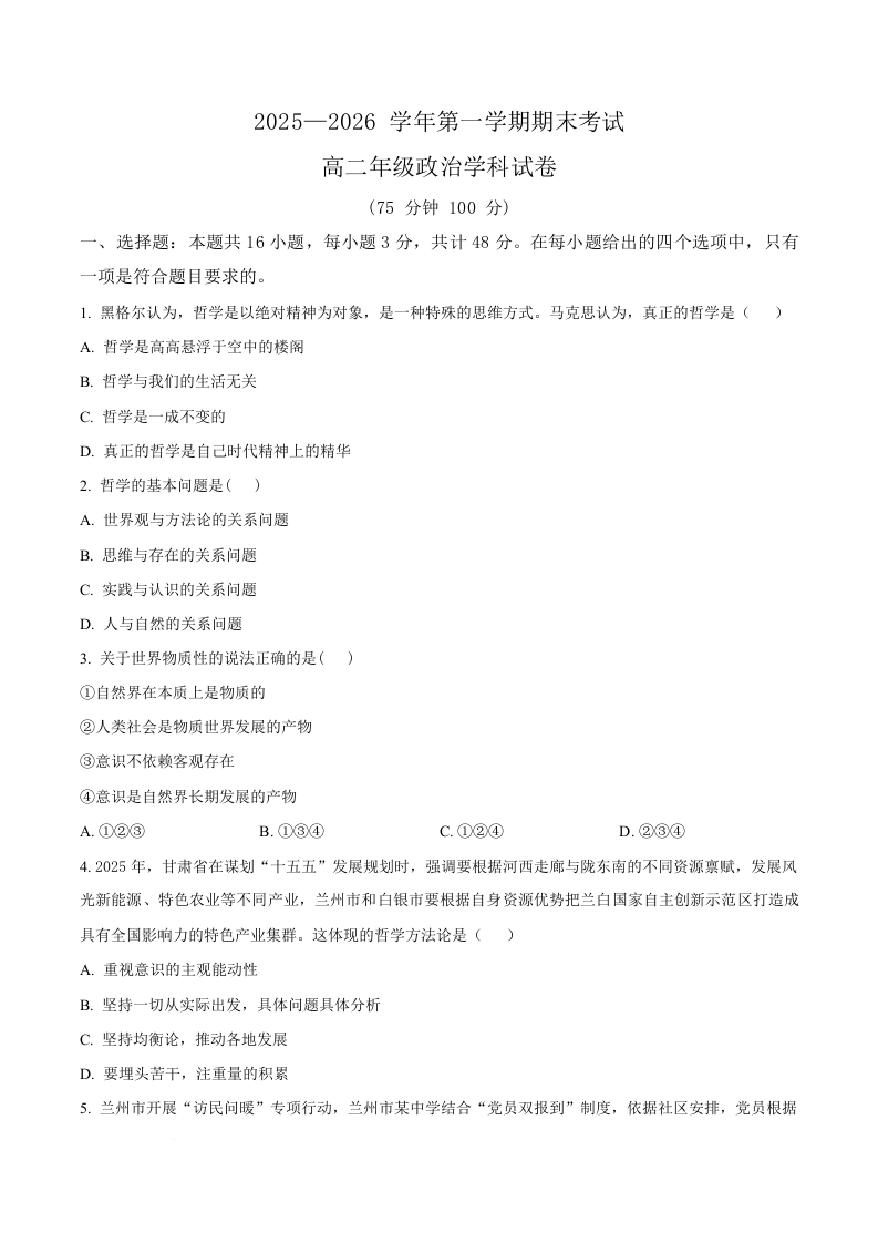 高二政治+答案--甘肃省兰州市八校联考2025-2026学年高二上学期期末考试