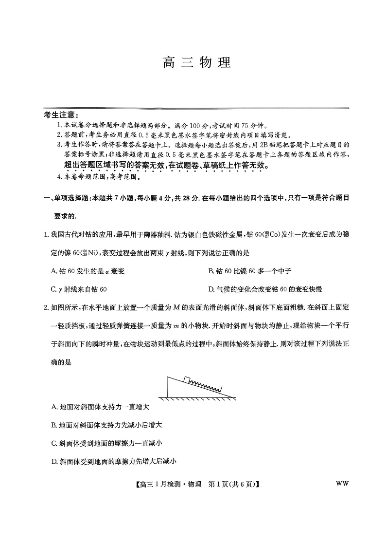 高三物理--九师联盟2026届高三1月质量检测