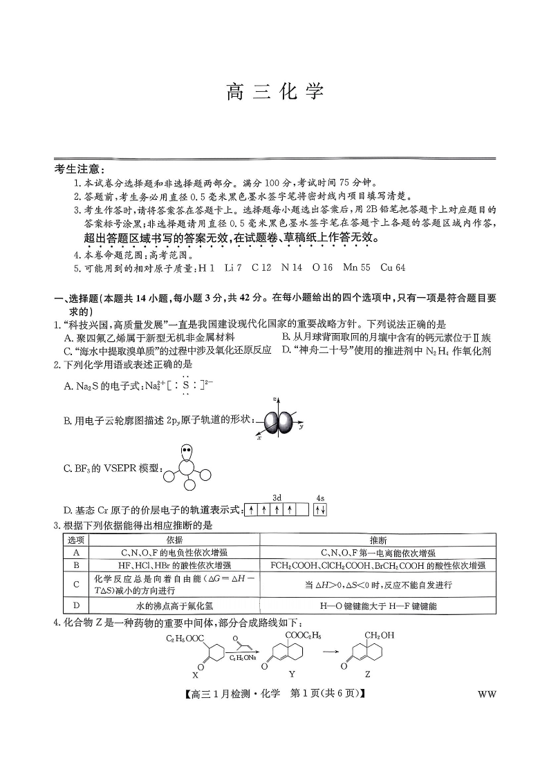 高三化学--九师联盟2026届高三1月质量检测