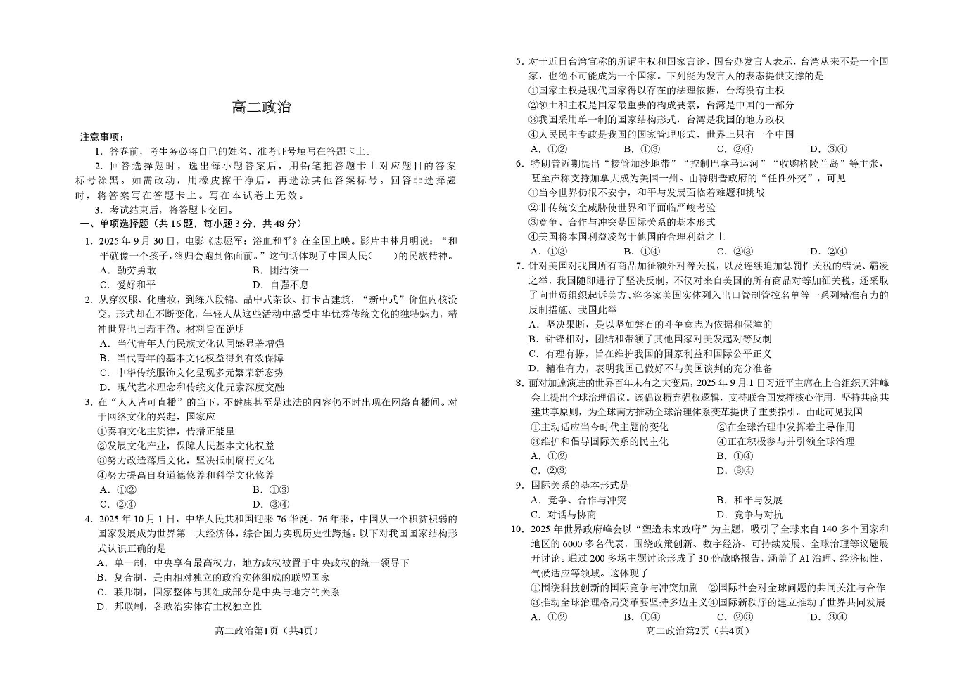 高二政治--吉林省普通高中友好学校联合体2025-2026学年高二上学期期末联考