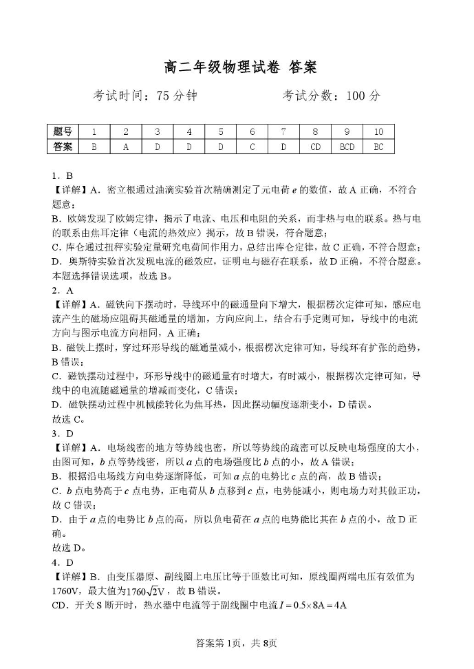 高二物理答案--辽宁省沈阳市五校协作体2025-2026学年高二上学期1月期末考试
