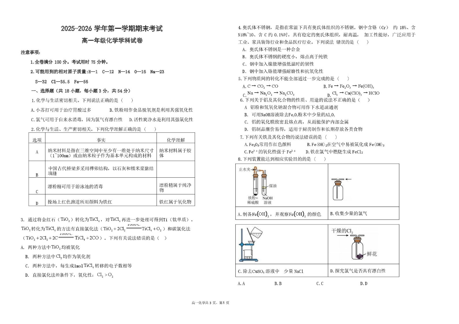 高一化学+答案--甘肃省兰州市八校联考2025-2026学年高一上学期期末考试