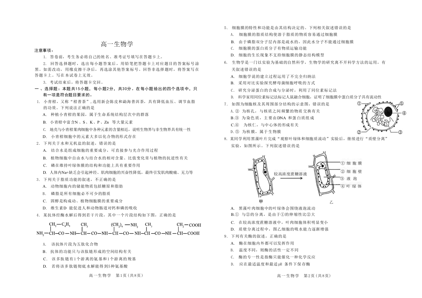 高一生物--吉林省普通高中友好学校联合体2025-2026学年高一上学期期末联考