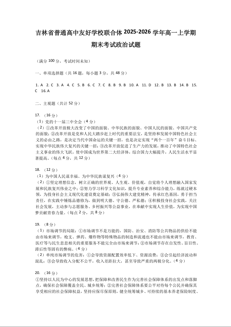 高一政治答案--吉林省普通高中友好学校联合体2025-2026学年高一上学期期末联考