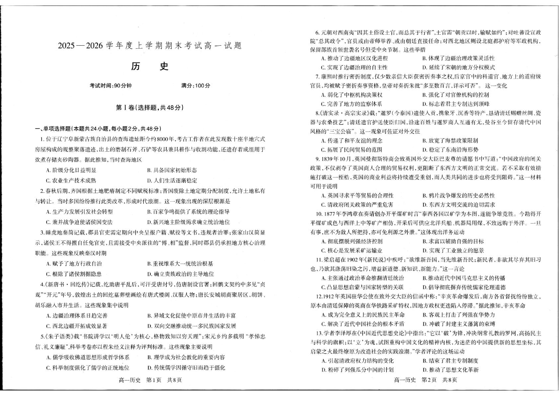 高一历史--辽宁省辽南协作体2025-2026学年高一上学期期末