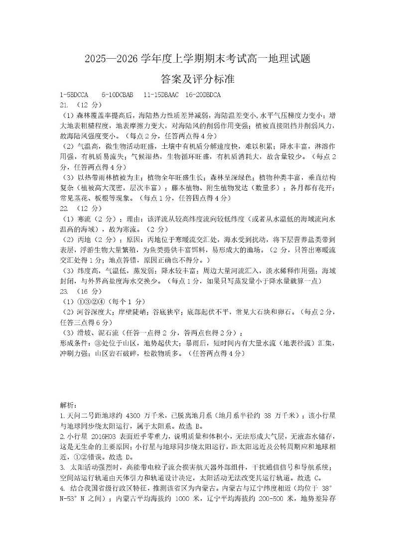 高一地理答案--辽宁省辽南协作体2025-2026学年高一上学期期末