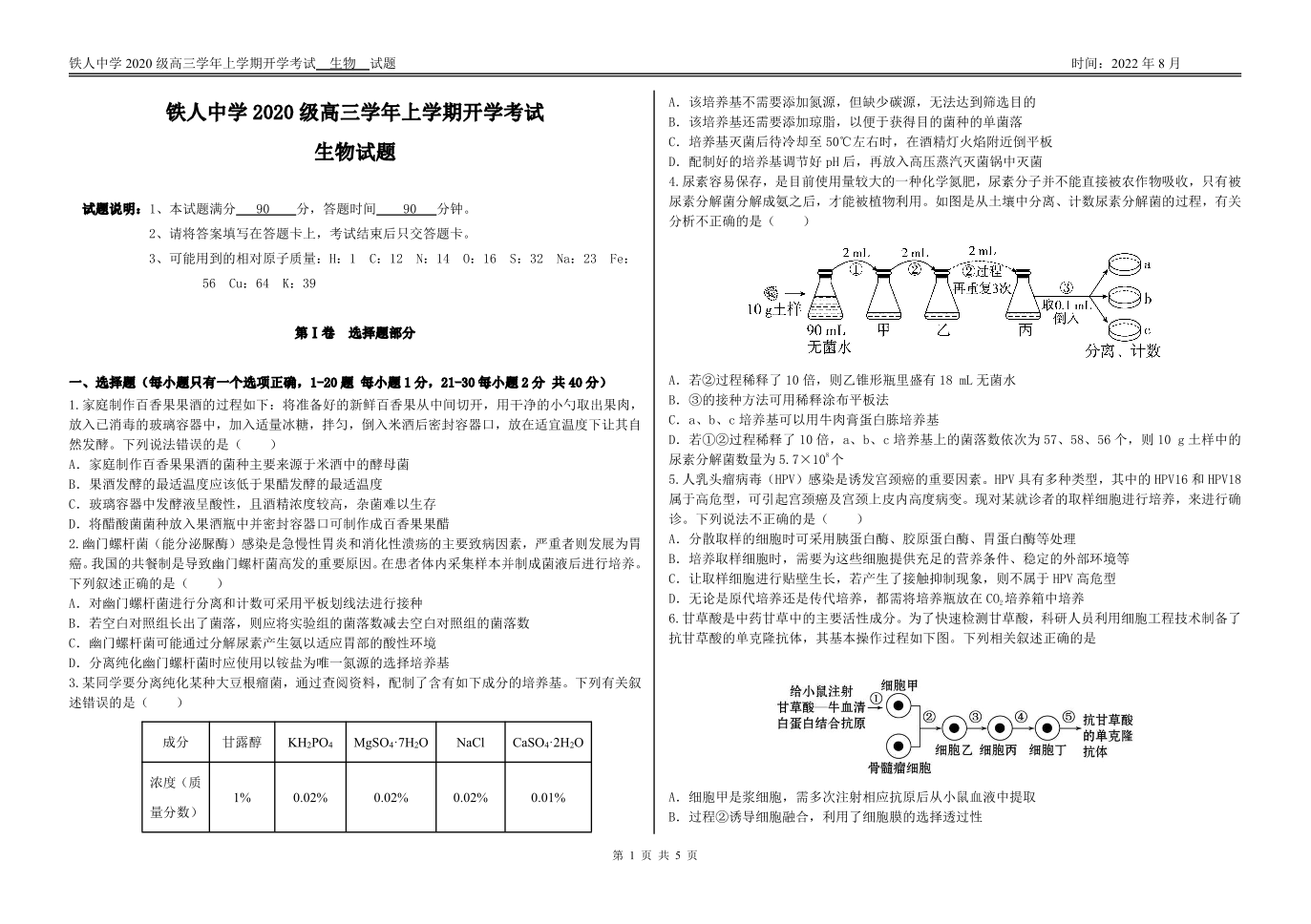 高三生物--黑龙江省大庆铁人中学2023届高三上学期开学考试