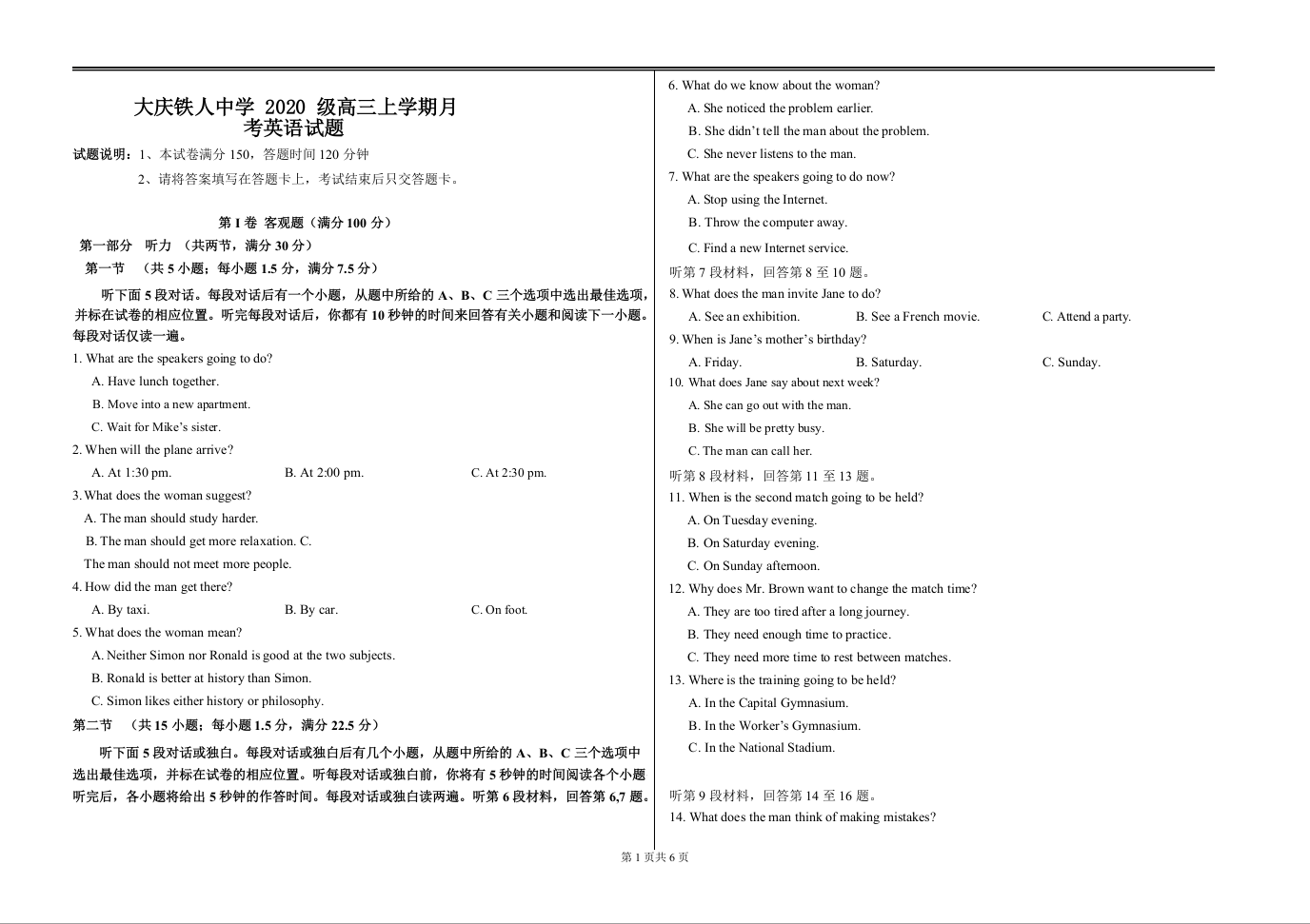 高三英语--黑龙江省大庆铁人中学高三上学期第一次月考