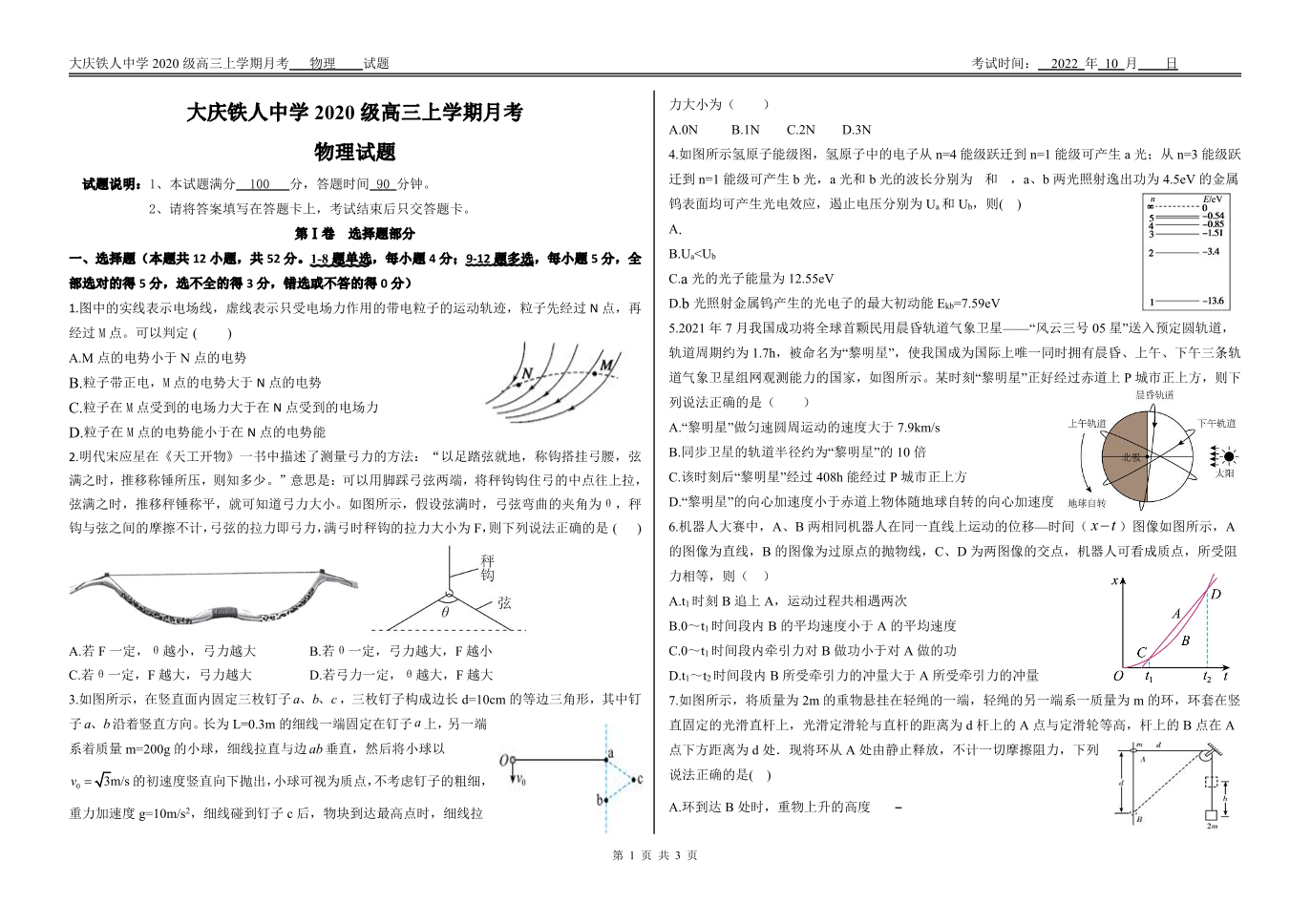 高三物理--黑龙江省大庆铁人中学高三上学期第一次月考