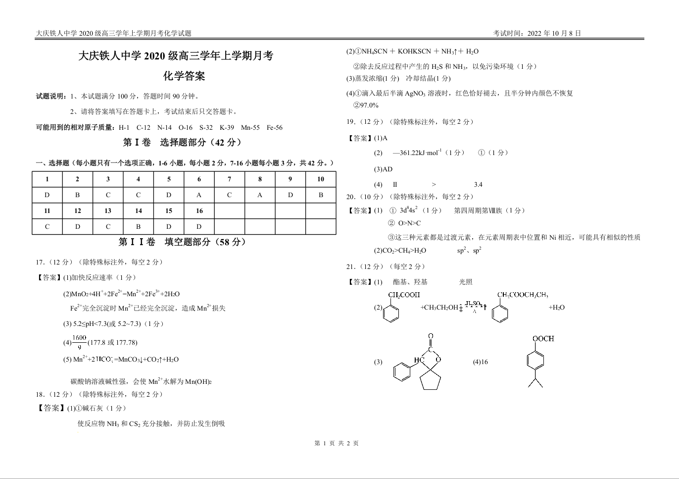 高三化学答案--黑龙江省大庆铁人中学高三上学期第一次月考