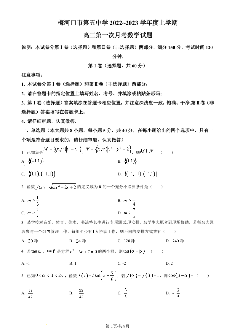 高三数学+答案--吉林省梅河口市五中2023届高三上学期第一次月考