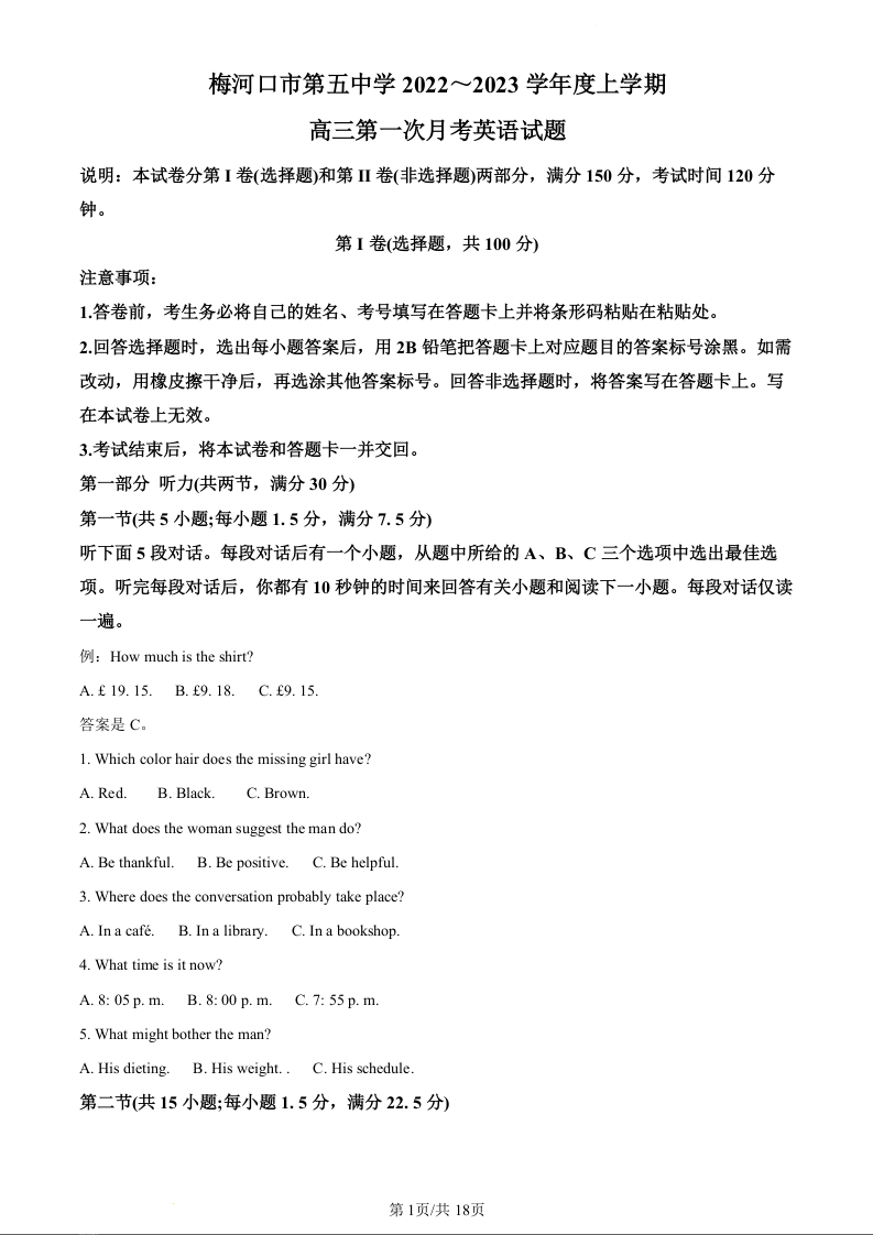 高三英语+答案--吉林省梅河口市五中2023届高三上学期第一次月考