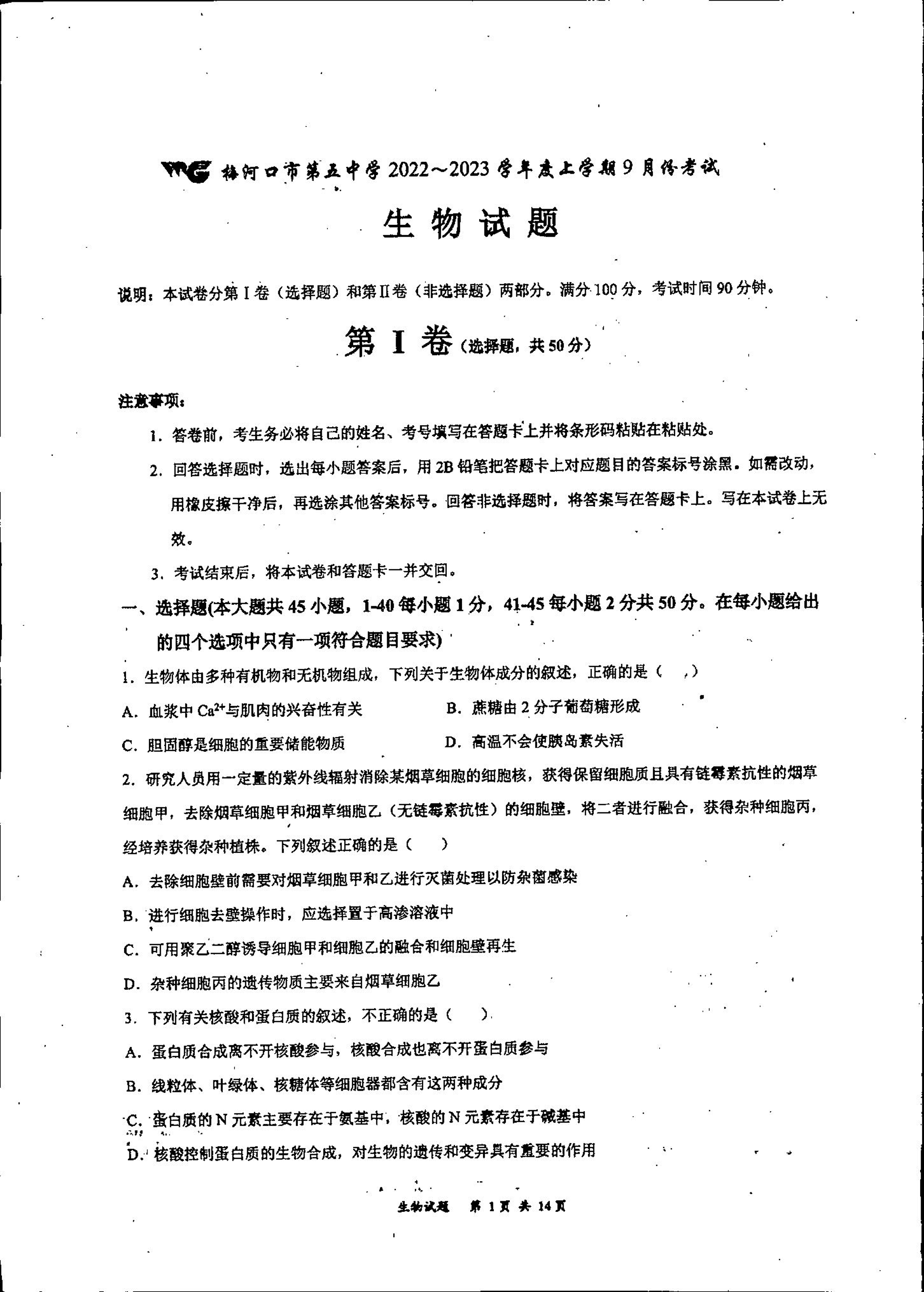 高三生物--吉林省梅河口市五中2023届高三上学期第一次月考