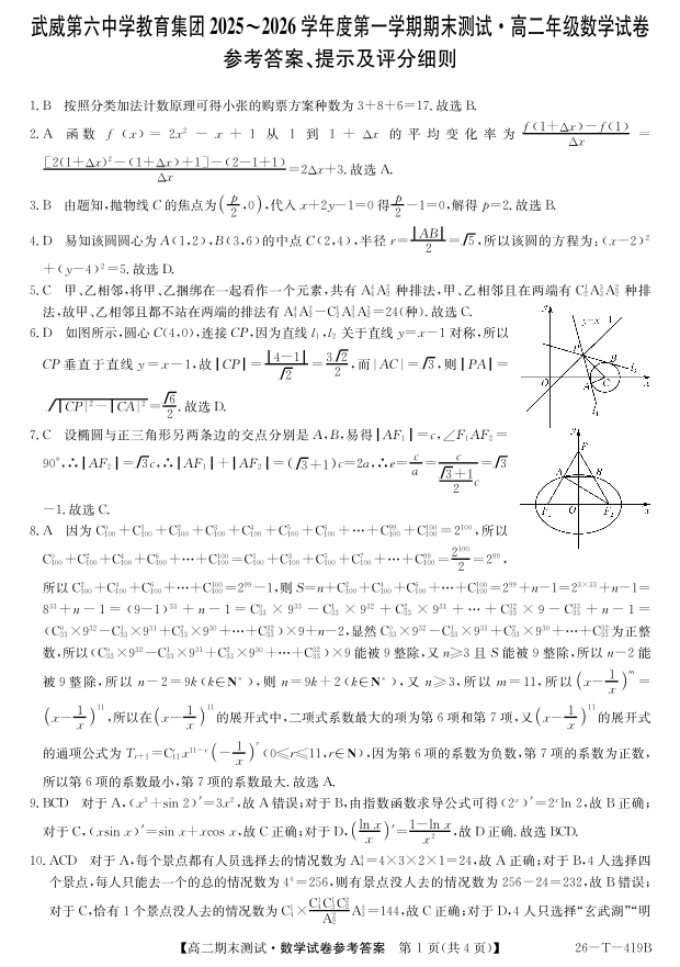 高二数学答案--甘肃省武威第六中学2025-2026学年高二上学期期末考试