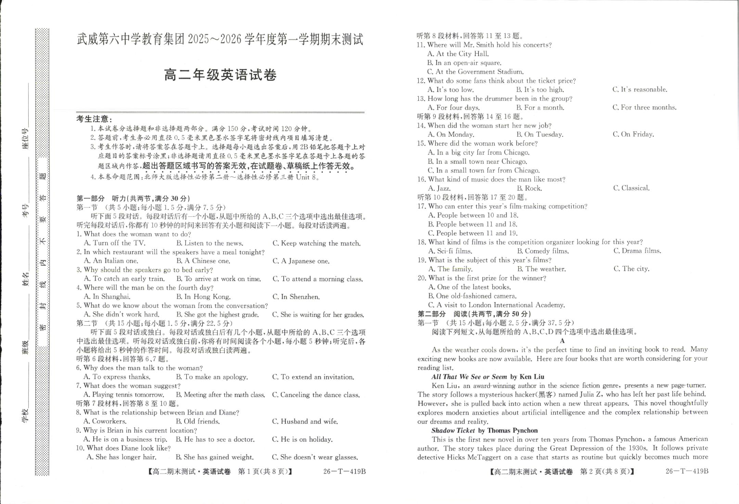 高二英语--甘肃省武威第六中学2025-2026学年高二上学期期末考试