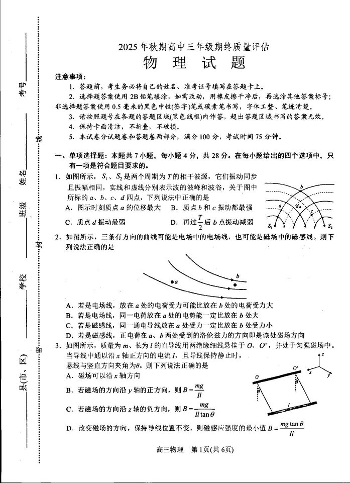 高三物理--河南省南阳市2026届高三上学期1月期终质量评估