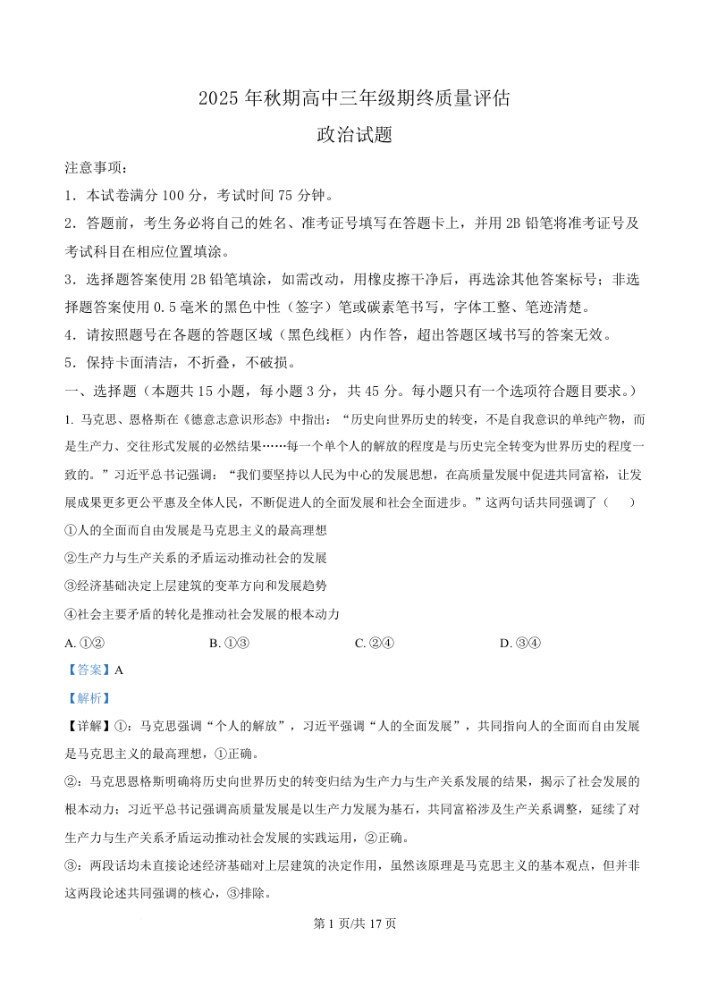 高三政治(精品解析版)--河南省南阳市2026届高三上学期1月期终质量评估
