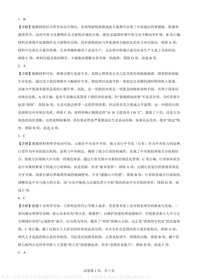 高一历史(解析版)--黑龙江省齐齐哈尔市部分学校2025-2026学年高一上学期1月期末考试