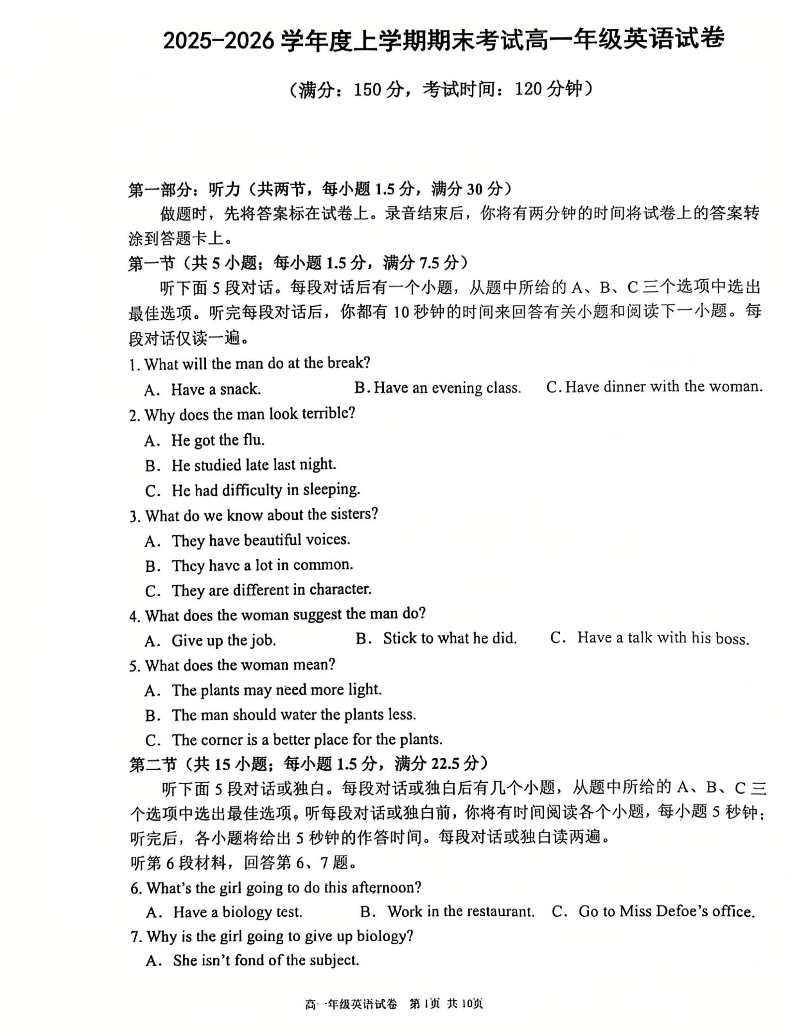 高一英语--辽宁省五校协作体2025-2026高一1月联考期末