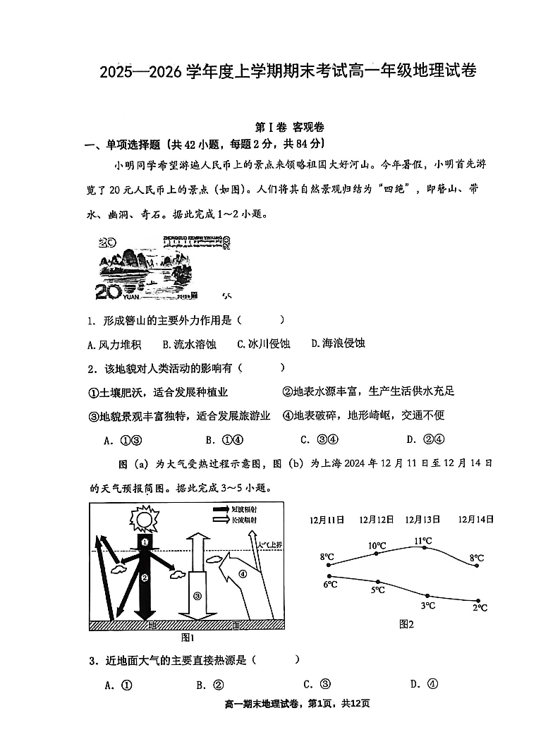 高一地理+答案--辽宁省五校协作体2025-2026高一1月联考期末
