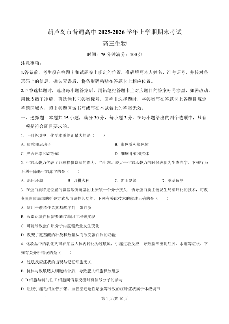 高三生物(原卷版)--辽宁省葫芦岛市2026届高三上学期1月期末考试