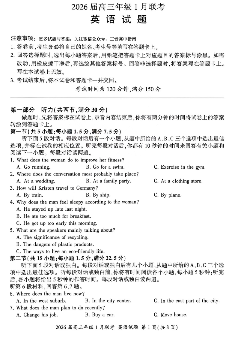 高三英语--百师联盟2026届高三九省联考1月期末考试