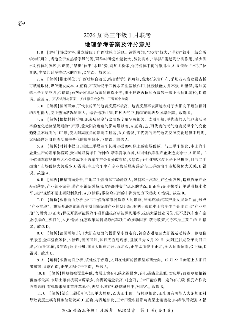 高三地理答案--百师联盟2026届高三九省联考1月期末考试