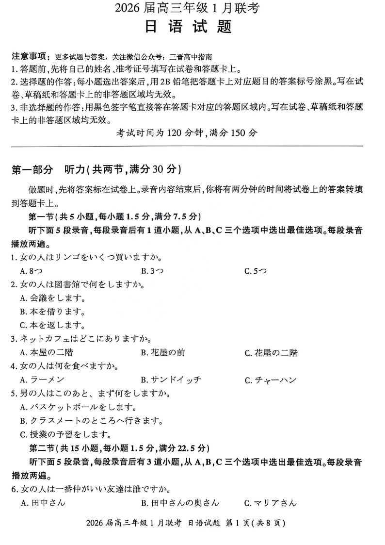 高三日语--百师联盟2026届高三九省联考1月期末考试