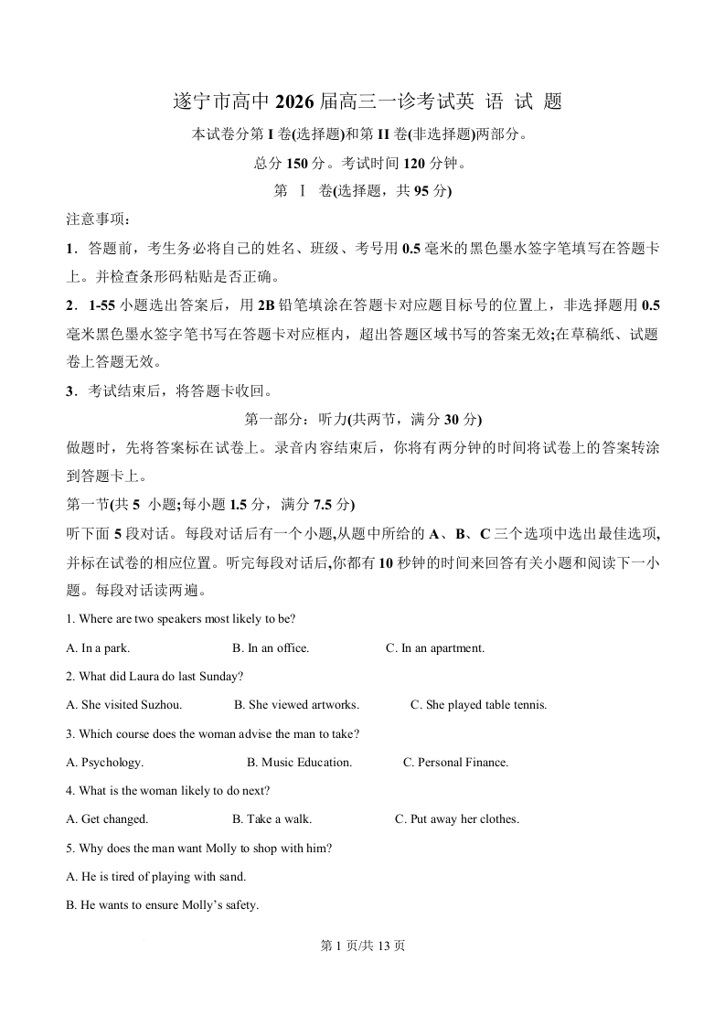高三英语(原卷版)--四川省遂宁市2026届高三上学期一诊考试(遂宁一诊)