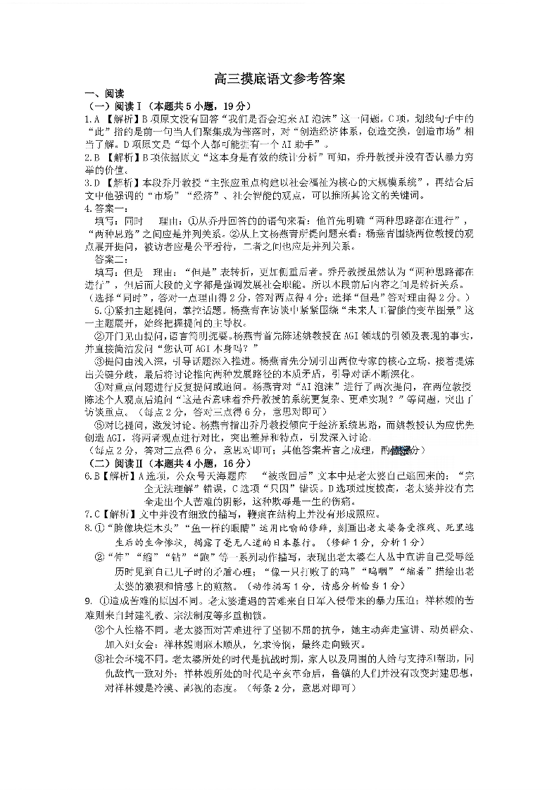 高三语文答案--2026届山东省淄博市第一学期高三摸底质量检测(期末)