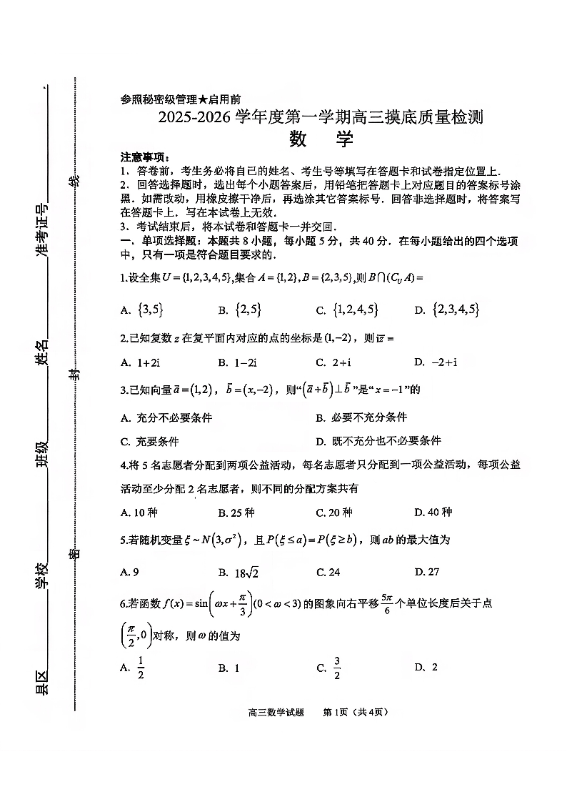 高三数学--2026届山东省淄博市第一学期高三摸底质量检测(期末)