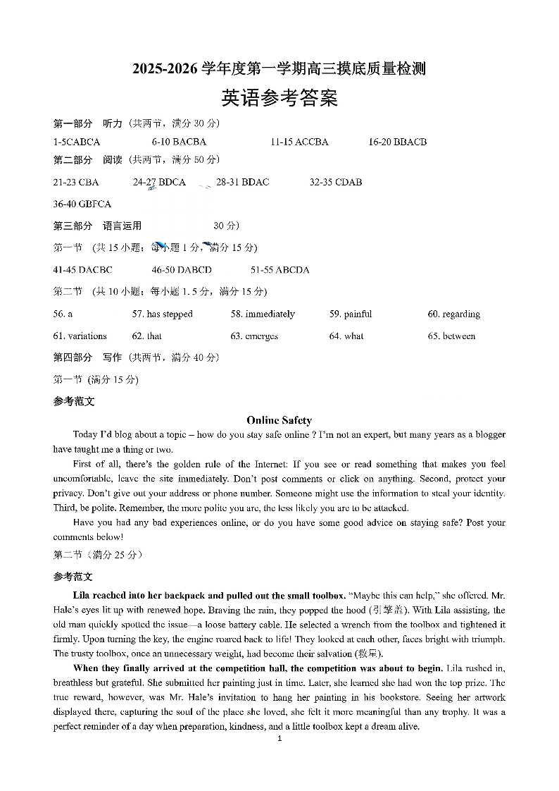 高三英语答案--2026届山东省淄博市第一学期高三摸底质量检测(期末)