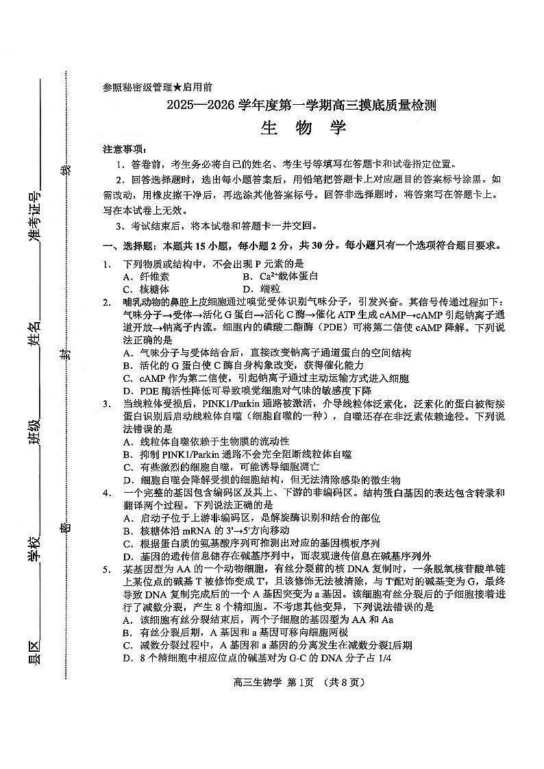 高三生物--2026届山东省淄博市第一学期高三摸底质量检测(期末)