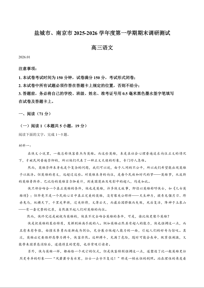 高三语文+答案--江苏省盐城市、南京市2026届高三上学期1月期末调研测试 (南京盐城一模)