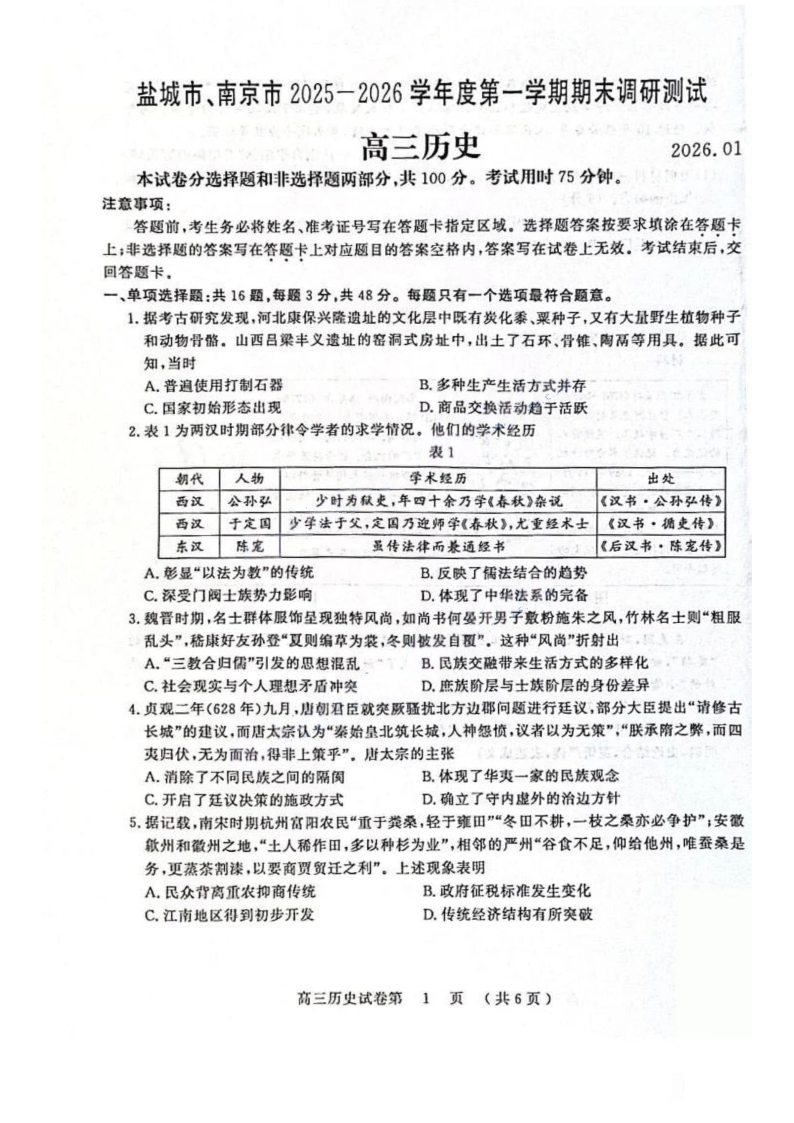 高三历史--江苏省盐城市、南京市2026届高三上学期1月期末调研测试 (南京盐城一模)