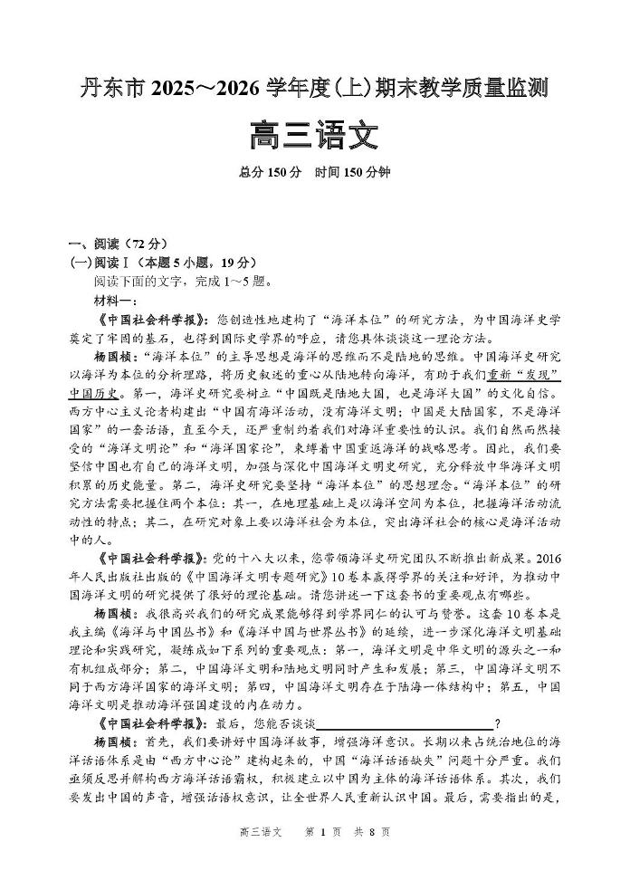 高三语文--辽宁省丹东市2026届高三上学期1月期末教学质量监测