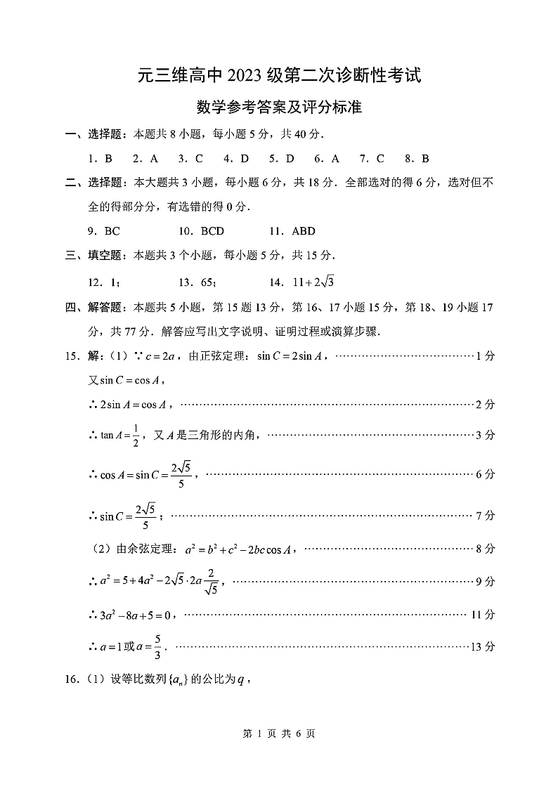 高三数学答案--四川省“元三维大联考”2023级高三第二次诊断考试(绵阳二诊B)