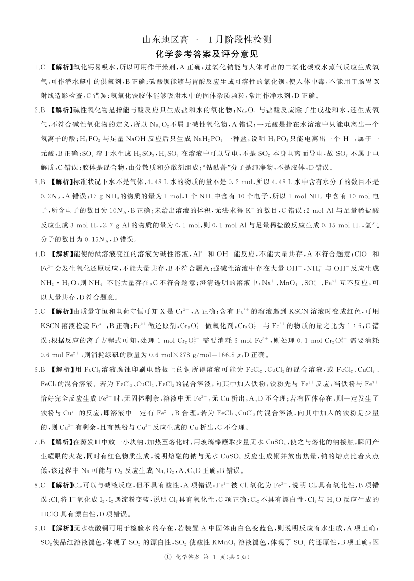 高一化学答案--山东省济南市名校联考2025-2026学年高一上学期1月月考