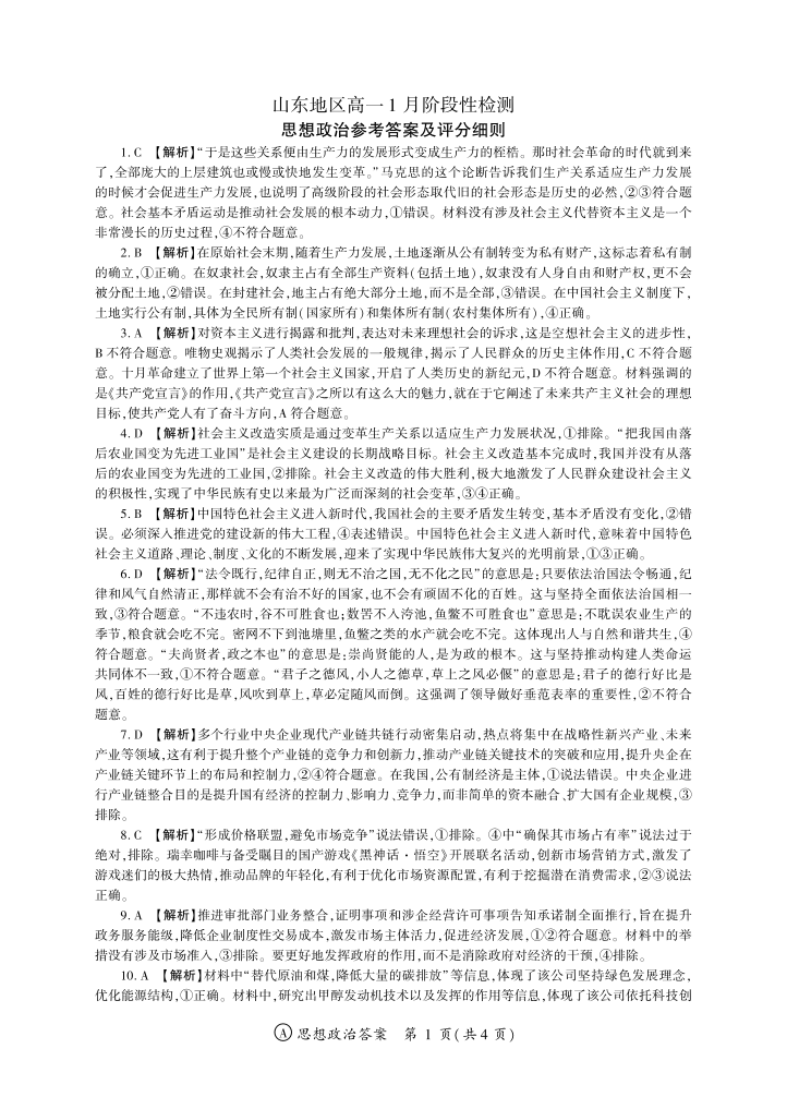 高一政治答案--山东省济南市名校联考2025-2026学年高一上学期1月月考