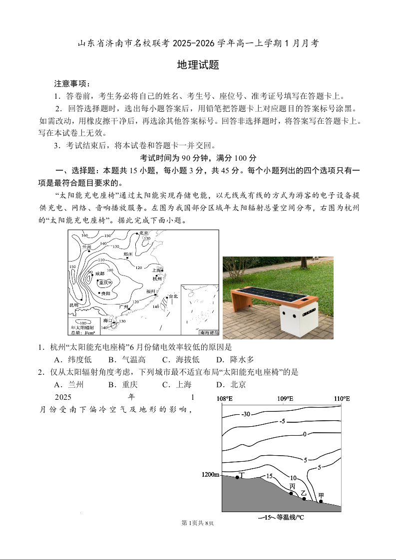 高一地理+答案--山东省济南市名校联考2025-2026学年高一上学期1月月考