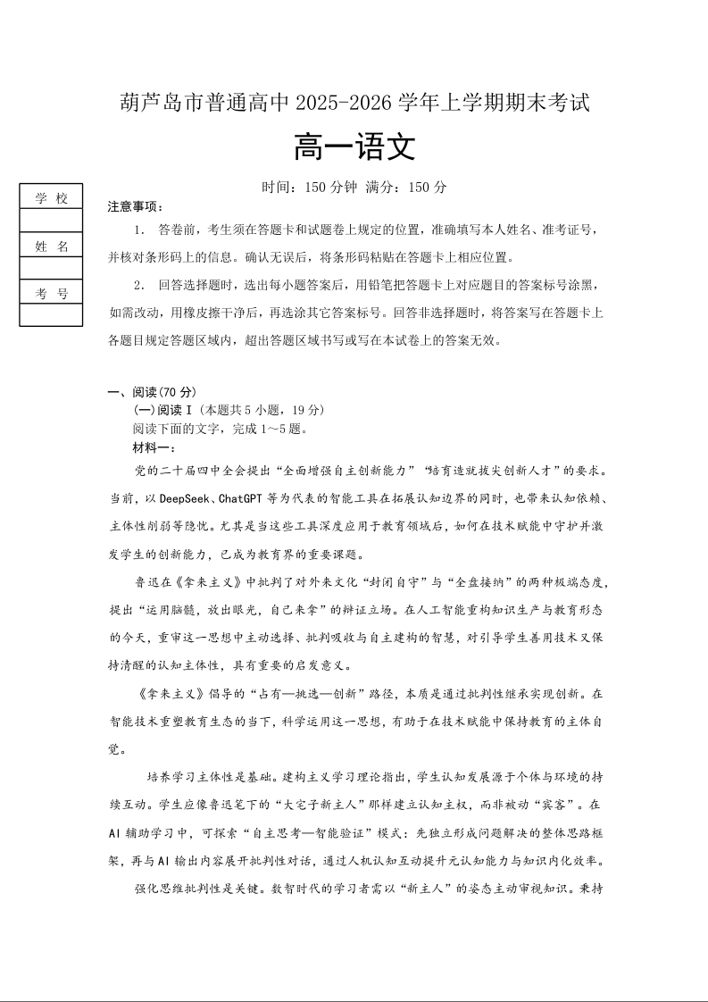 高一语文--辽宁省葫芦岛市2025-2026学年高一上学期1月期末