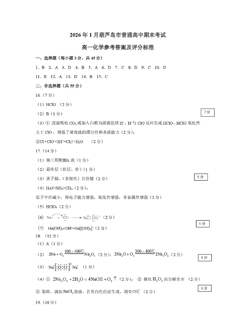 高一化学答案--辽宁省葫芦岛市2025-2026学年高一上学期1月期末