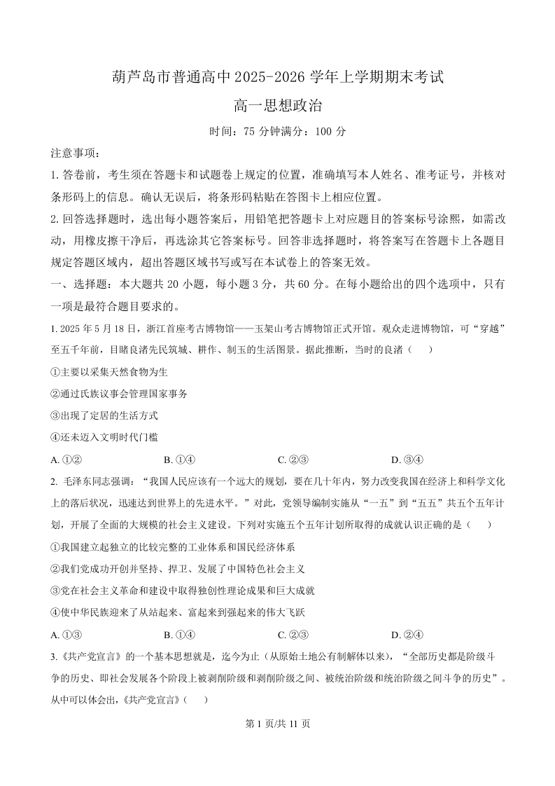 高一政治+答案--辽宁省葫芦岛市2025-2026学年高一上学期1月期末